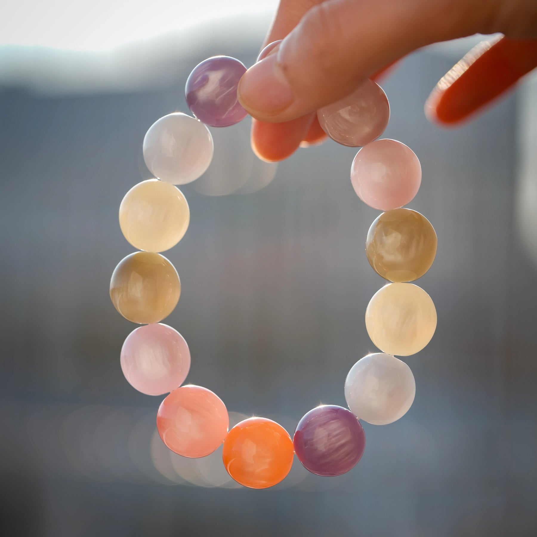 Crafted from pure natural mica, this bracelet presents a calm, soft white tone under indoor light—clean, warm, and quietly refined.