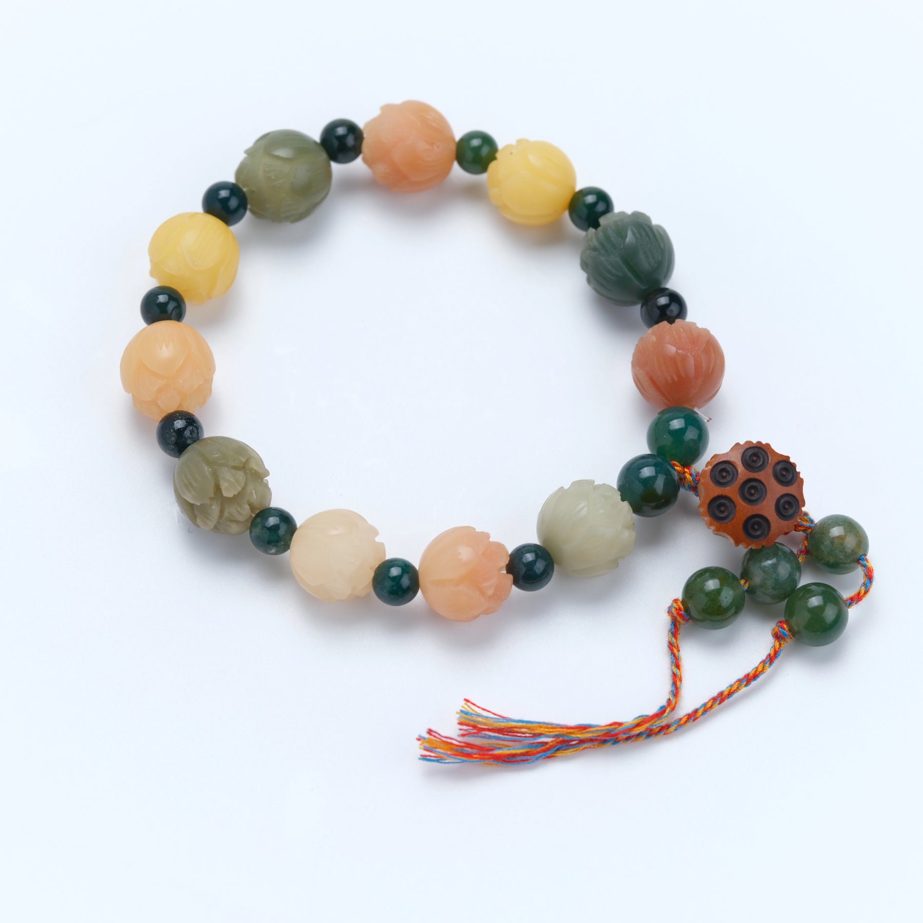 Crafted from bodhi seeds, agate, and fabric, with lotus (purity), lotus pod (completion), Nine-Palace Grid (cosmic order), and colorful tassels. Celadon green and warm wood tone, it means mindfulness and smoothness. Ideal for zen practitioners/tea lovers, daily/tea ceremony wear. Avoid moisture; keep bodhi seeds away from sun; maintain agate with a soft cloth.