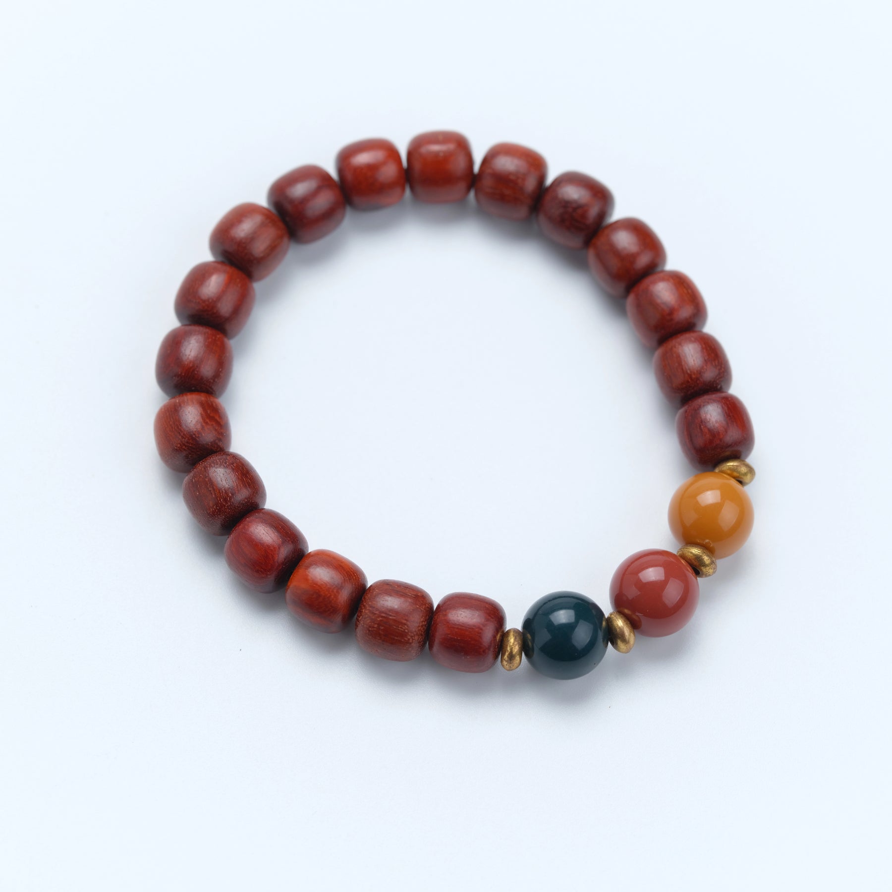 This bracelet is made from small-leaf red sandalwood, agate and metal, reddish brown, red, blue, yellow, antique and diverse, with multi-gem spacer beads (symbolizing the harmony of the Five Elements: red sandalwood belongs to Wood, red agate belongs to Fire, blue agate belongs to Water, yellow agate belongs to Earth, and the golden spacer). It functions to calm the mind, embrace blessings, supplement Wood element, and harmonize the Five Elements, suitable for office, meditation and daily wear, ideal for those needing Wood element in numerology and professionals.